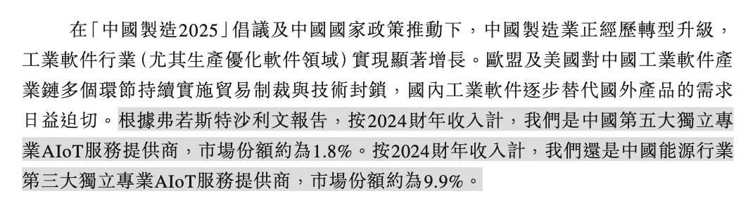 根据弗若斯特沙利文报告,按2024财年收入计,公司是中国第五大独立专业AIoT服务提供商,市场份额约为1.8%。按2024财年收入计,公司还是中国能源行业第三大独立专业AIoT服务提供商,市场份额约为9.9%。