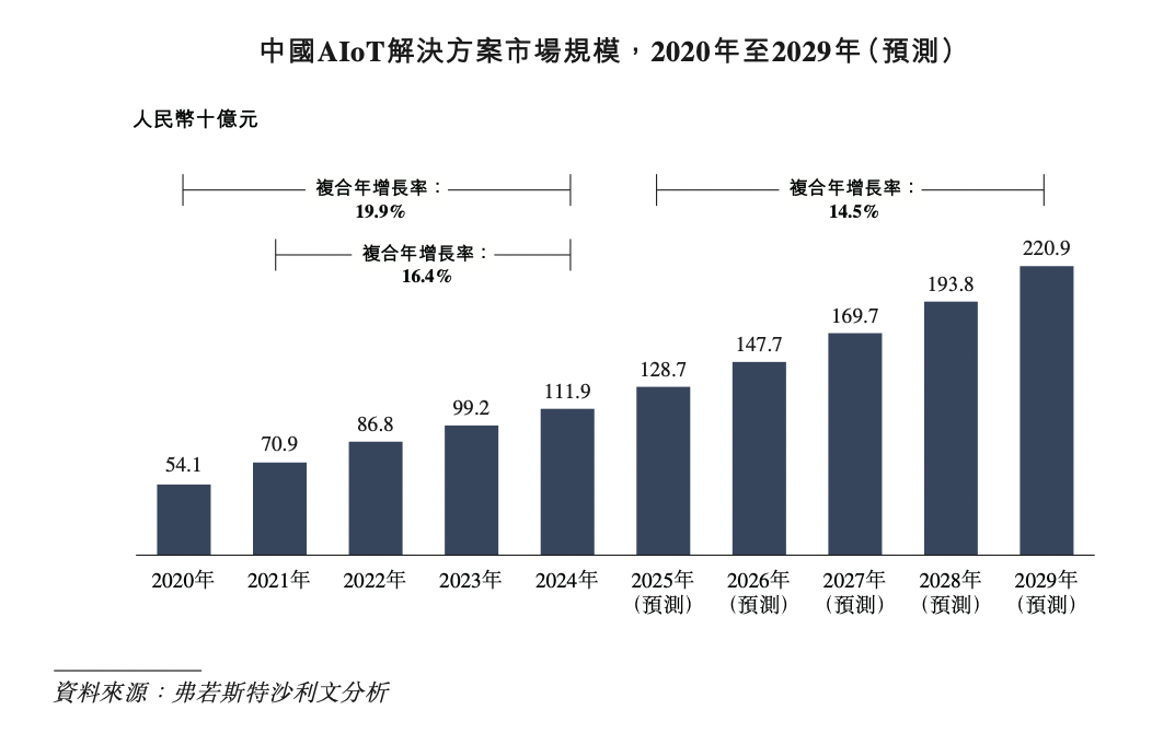 中国AIoT市场近年来增长迅猛,其规模由2020年的约541亿元扩大至2024年的约1,119亿元,预计于2029年将达到约2,209亿元。此增长主要源于政策支持、制造业对数字化转型日益增长的需求,以及5G与AI技术的广泛应用。AIoT透过增强设备连接、优化生产流程及提升资源利用率,已成为推动各行业效率提升与创新的核心动力,展现出巨大的市场潜力与长远的发展前景。