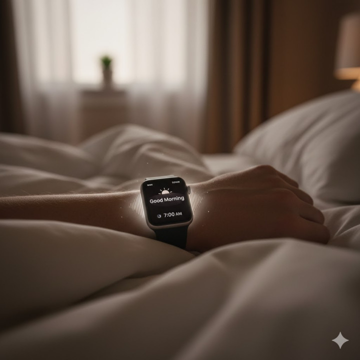 一只手佩戴 Apple Watch 在床上被唤醒的特写,突出安静的氛围