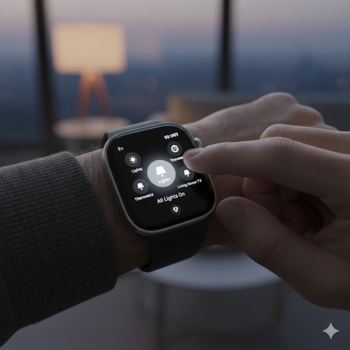 Apple Watch 界面显示“遥控器”或“家庭”App 控制灯光的场景